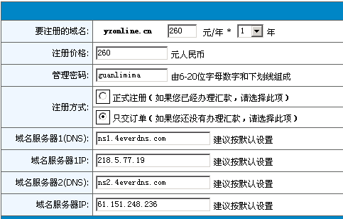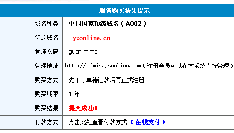 此時您將看到訂單提交的結果,如果您的帳戶上有足夠款項,并且您選擇的注冊方式是"正式注冊",那么域名將馬上注冊成功并扣除注冊款項,如果您選擇的注冊方式是"只交訂單",那么域名并沒有真正生效,只是提交到了我們的申請訂單里,這時,您需要按"匯款方式"辦理匯款,并通知我們,我們將馬上為您辦理后續事宜。完全不用您自己操心。