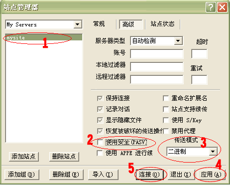 4.點擊上圖 6 處, 切換到“高級”標簽(如下圖)。 在1處選中剛建立的站點名稱(mysite),將2處的選鉤去掉,在3處的“傳送模式”選擇二進制,點擊4處“應用”。